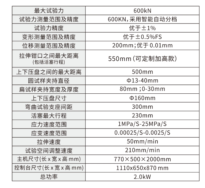 该试验机采用微机控制高精度电液伺服阀驱动精密液压缸,实现等速率试验力、等速率位移、等速率变形等多种模式的自动控制,完成对试样的拉伸、压缩、抗弯抗折试验,符国家标准 GB/T228-2002《金属材料室温拉伸试验方法》的要求。增加附具,可完成其他各种材料的试验要求